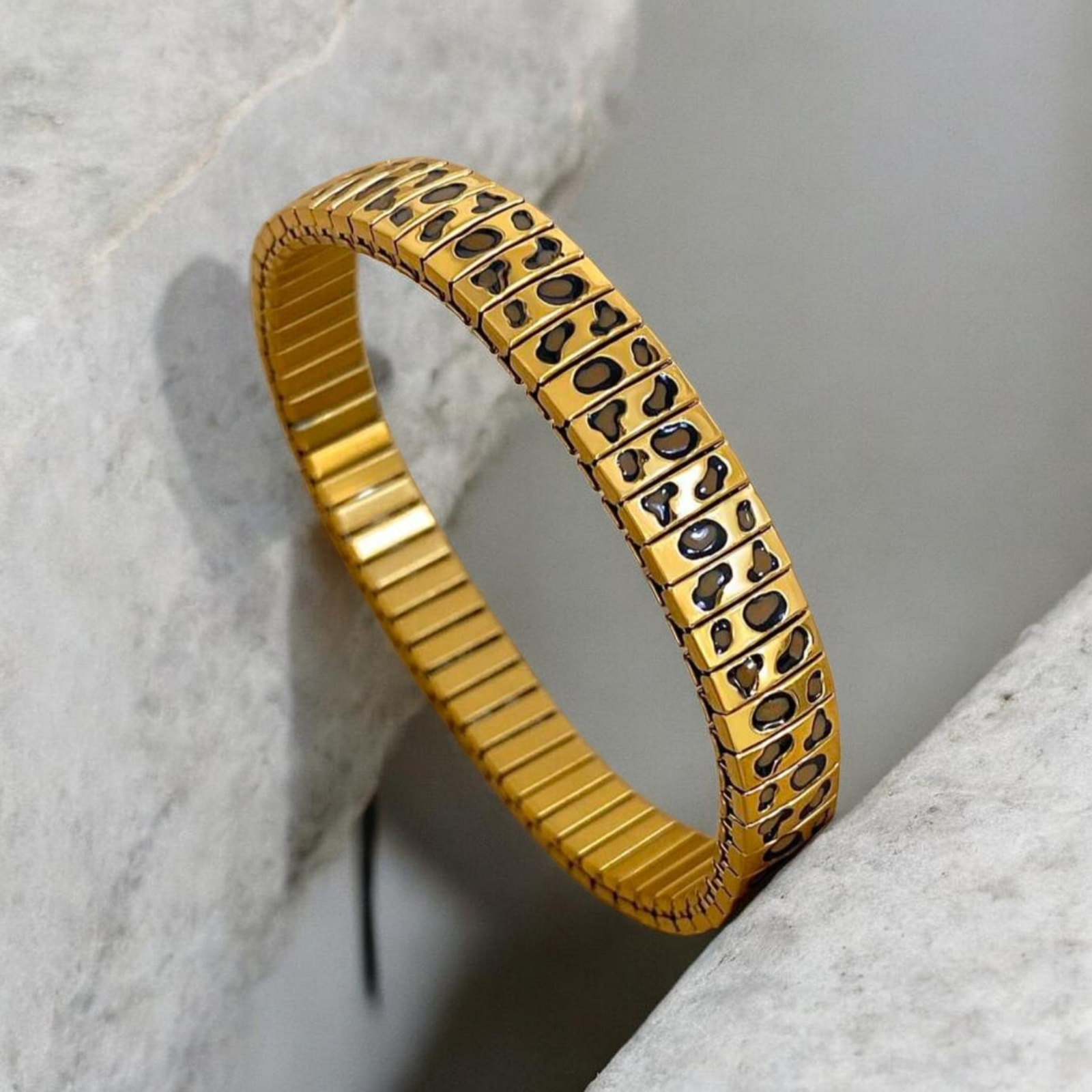 The Leopard Pattern Stretch Bracelet features a sleek, flexible design accented with bold leopard-print details for a stylish, modern look. Its slim rectangular links create a smooth, structured appearance while allowing the bracelet to stretch comfortably for easy wear.